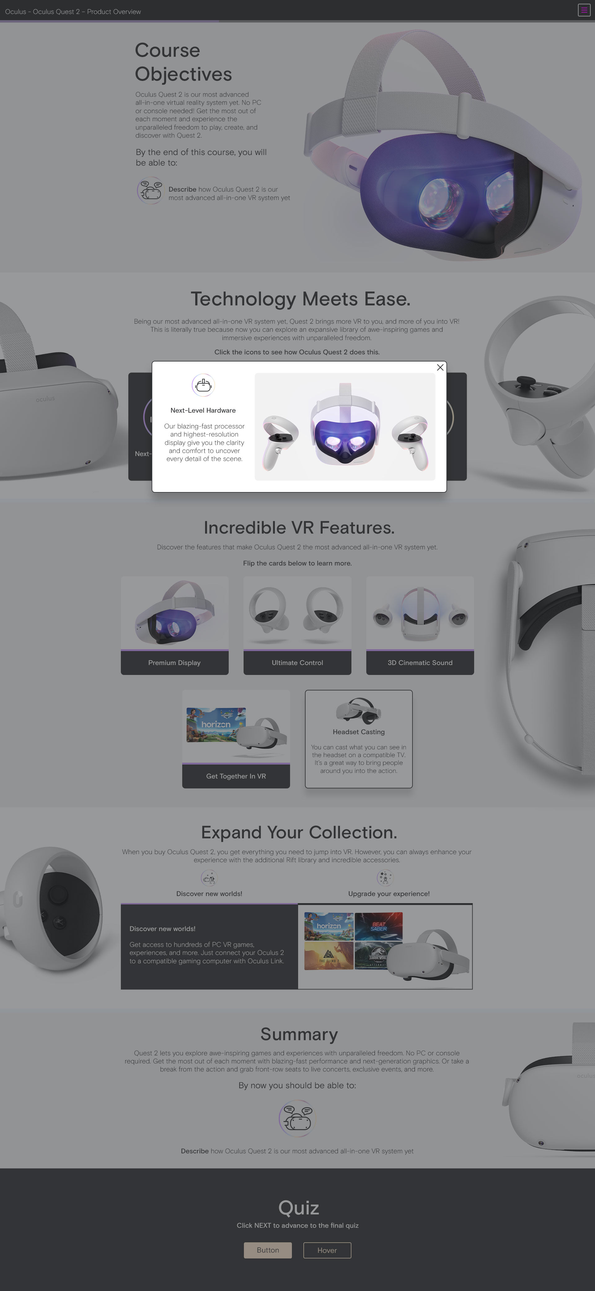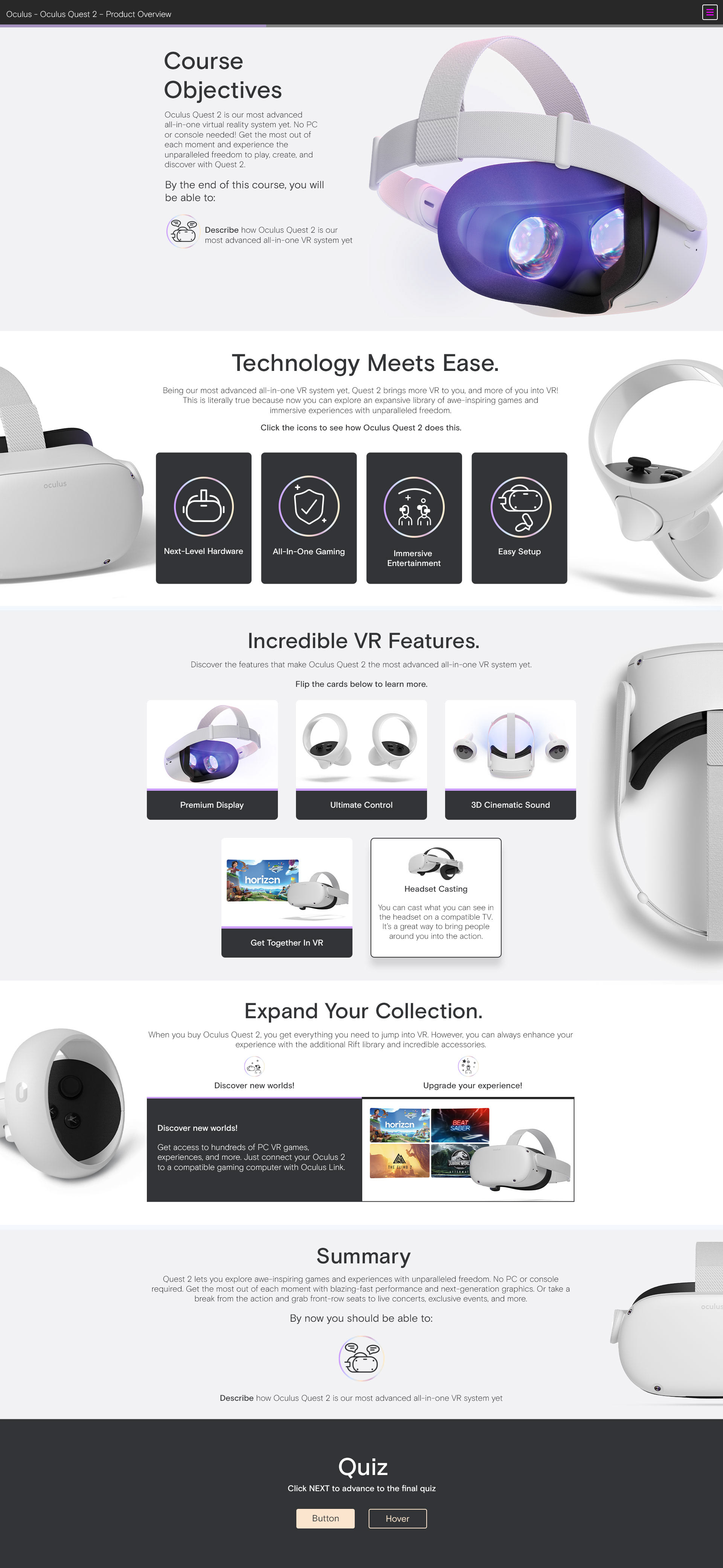 This project focused on the product and instructional design for Oculus by Meta, specifically targeting its gaming audience. Oculus has positioned the Rift as a gaming-centric device, with a primary content focus on immersive gaming experiences. My role involved designing intuitive user interfaces and creating instructional materials to help game developers port existing first-person or fixed-camera games into virtual reality. The instructional content was aimed at streamlining the development process, enabling developers to leverage VR technology and create compelling gaming experiences for Oculus users.